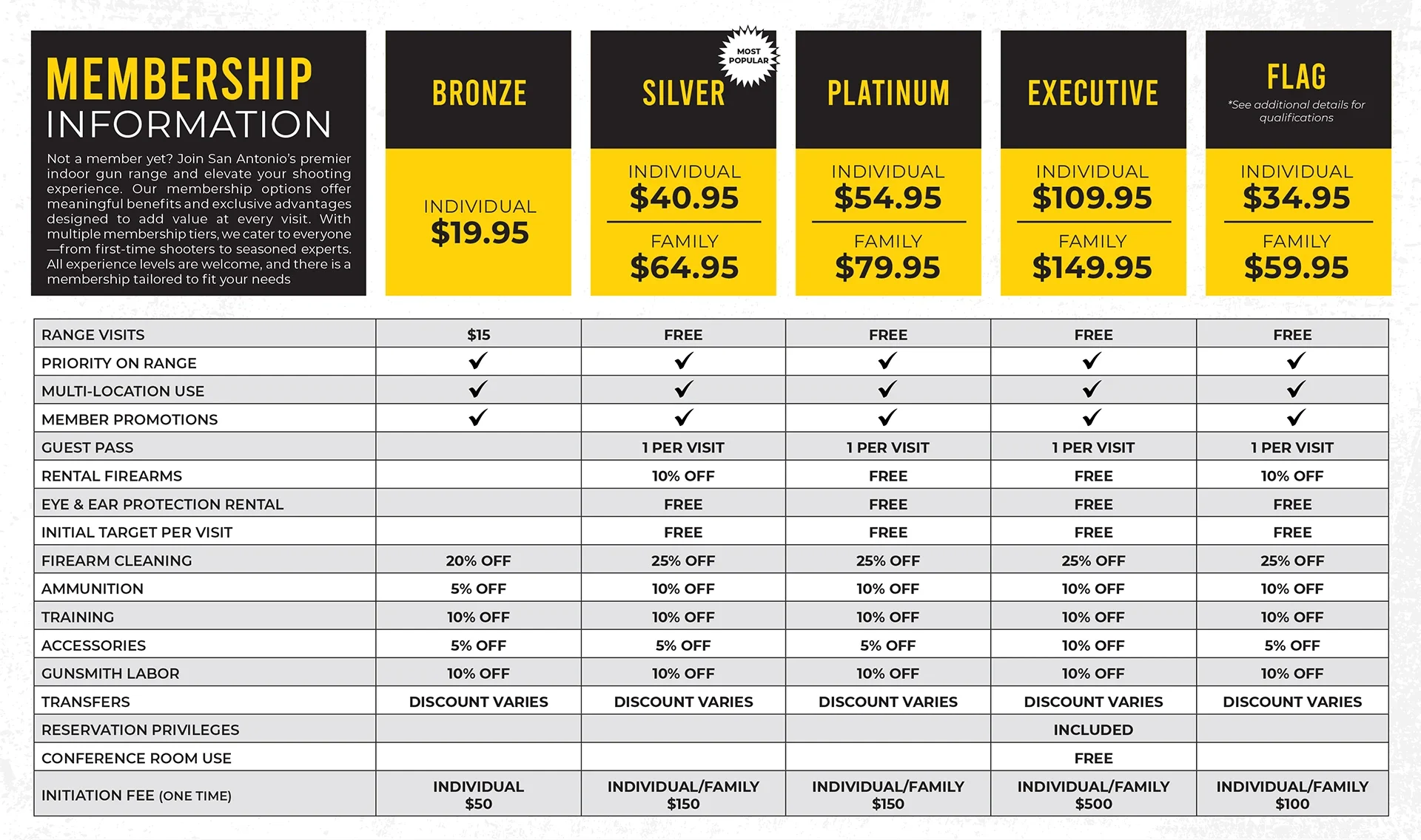 Designed specially for active Police, Military, or other credentialed First Responders that “actively” carry a firearm and need a place to train, our Flag membership offers the same robust benefits as the Silver Plan allowing the ones who protect us to easily and routinely sharpen their skills. This plan offers a reduced initiation and monthly fee and is available for both individuals and families. Please see the membership desk to see if you qualify under the Flag Plan.